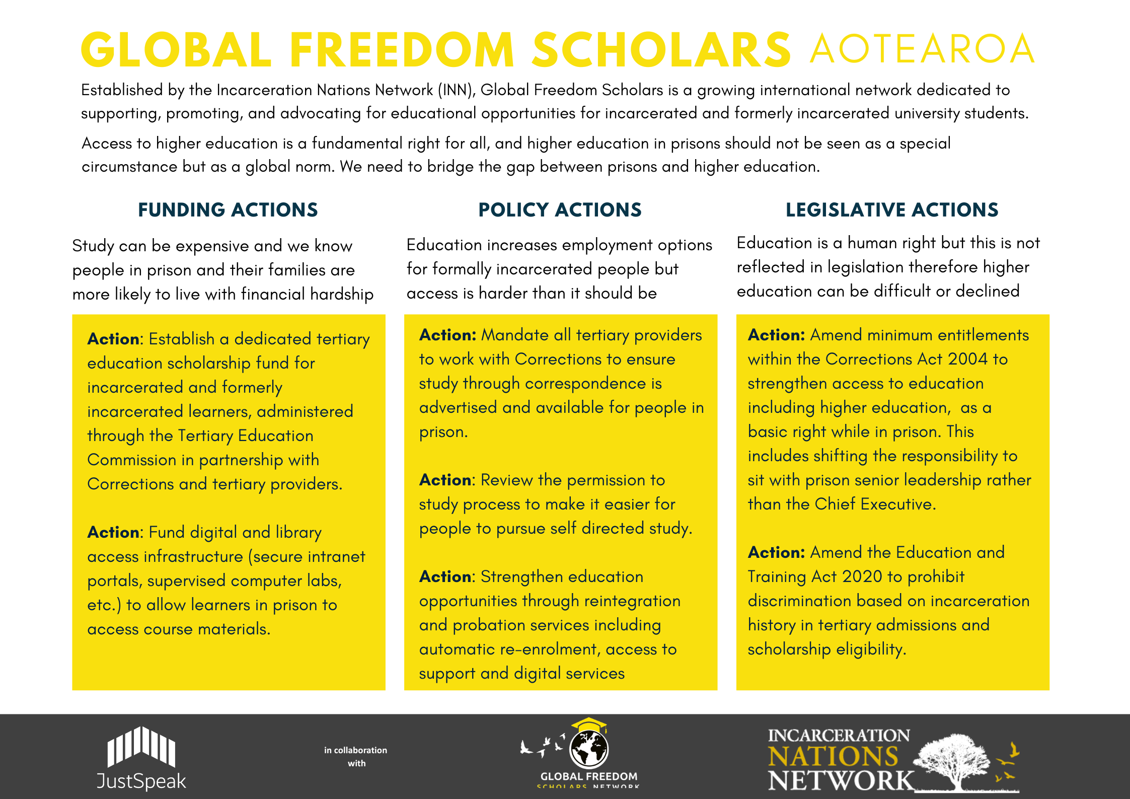 We are implementing a Global Freedom Scholars Aotearoa (GFSA) academic mentoring programme to support those with lived experience of the justice system to achieve their educational goals. Access to higher education in prisons in Aotearoa is currently very limited - we want to see this change!